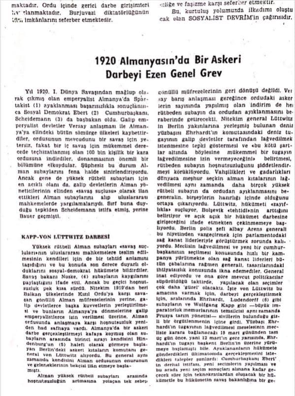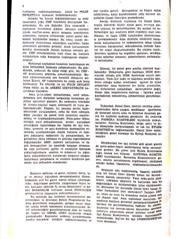 40 yıl sonra bugün o zamanın büyük sol gruplarının yönetici konumundaki mensuplarından kime sorsanız size darbenin geldiğini gördüklerini söyleyecektir. Görüp de kendilerine sakladılarsa onu bilemeyiz! Ancak bildiğimiz şudur: Böyle bir şeyi veya çok açık bir ihtimali bilip de yüksek sesle ve adıyla sanıyla ilan etmemek, emekçileri uyarmamak ve de kitlelere yönelik somut bir mücadele çağrısı yapmamak devrimci ve politik bir tutum değildir. Burjuvazinin kötü niyetleri ve faşizmin melanetleri üzerine edilmiş harcıâlem laflardan söz etmiyoruz. Kastımız, açık çağrılar, adı konmuş uyarılar, somut eylem programları ve mücadele taktikleridir. Kâğıda dökülmüş tek bir açık çağrı, uyarı bile önemlidir; eğer varsa 40 yıl sonra da olsa öğrenmekten sevinç duyarız.