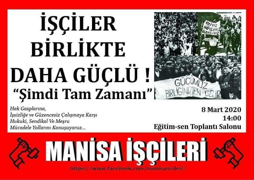 Manisa İşçileri, “Hak Gasplarına,İşsizliğe ve Güvencesizliğe” karşı mücadele etmek için toplanıyorlar. “Birlikte güçlüyüz “diyen İşçiler, 8 Mart pazar saat 14:00 Manisa Eğitim-Sen’de toplanacaklar. KG Manisa...