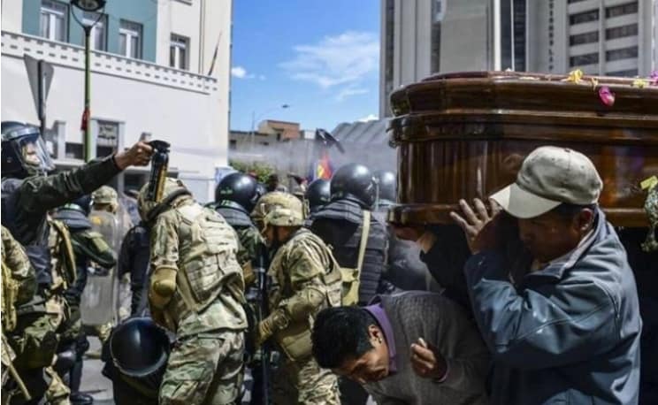 Darbe karşıtı gösteriler güçlenirken cuntanın ve milislerinin şiddeti de artıyor. Onlarca direnişçi öldürüldü, yüzlerce yaralı ve tutuklu var. El Alto’daki gaz fabrikasındaki direnişe yapılan kanlı müdahale bunlardan bir tanesi… 8 Emekçinin öldürüldüğü direnişin ardından, tabutlarıyla cenazeden çıkan halka askerler yeniden saldırdı. Yeni başkan silahlı kuvvetleri “cezai sorumluluktan” muaf tutan yasayı onaylarken, Eva Morales ise direnişi örgütlemek yerine halkı cuntayla diyaloğa çağırıyor.
