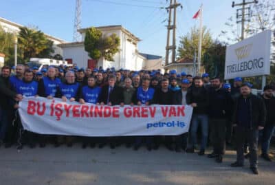 Petrol-İş Gebze Şubesi’nde örgütlü Trelleborg işçileri, sözleşme sürecinde anlaşma sağlanamaması sebebiyle 10 Aralık tarihinde greve çıkmıştı. Zorlu kış koşullarında, 44 gün boyunca sınıf mücadelesini zaafa uğratmadan grevi canlı tutan işçiler, taleplerine yakın şartlarda sözleşme im...