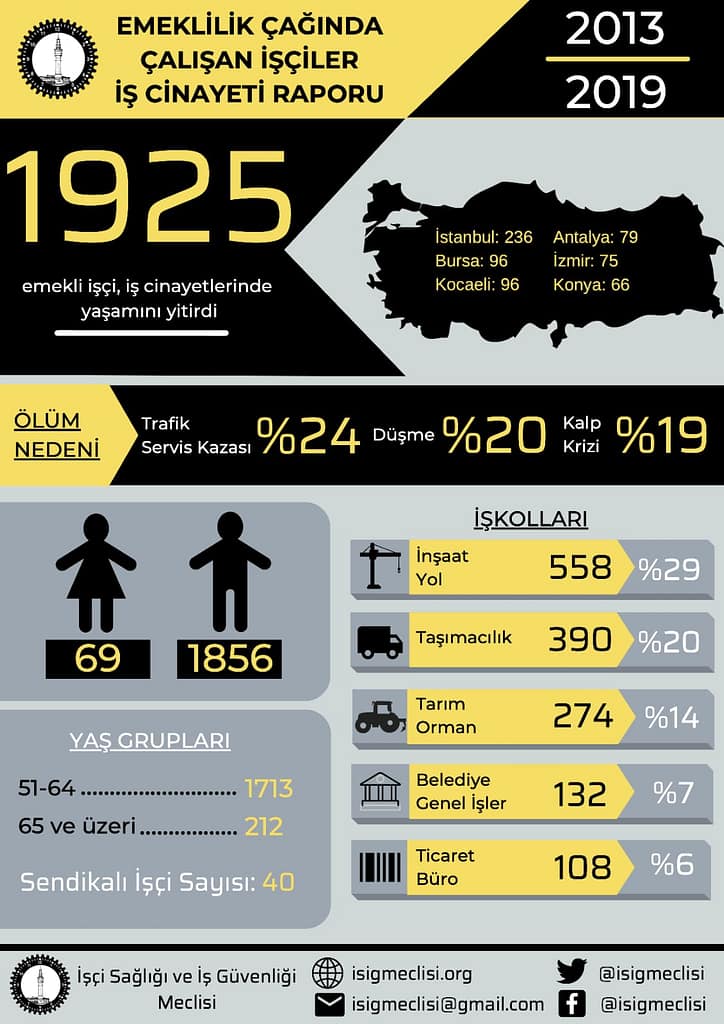 ISIG meclisi emeklilik çağında hala çalışmak zorunda olan işçiler için bir rapor paylaştı. Bu rapora göre, emeklilik çağında olmasına rağmen, hala çalışan işçiler arasında 2013-2019 yılları arasında iş kazasında ölüm sayısı 1925. Bu işçilerden %50’si, inşaat-taşımacılık gibi daha gündelik kazanca dönük geçici işler arasında çalışanlar. Ölümlerin %97’si bu yaşta ve geçici sürelerde çalıştığı için sendikalı da olamayan işçiler arasında. %19 luk bir oran ise, çalışırken kalp krizinden ölmüş.