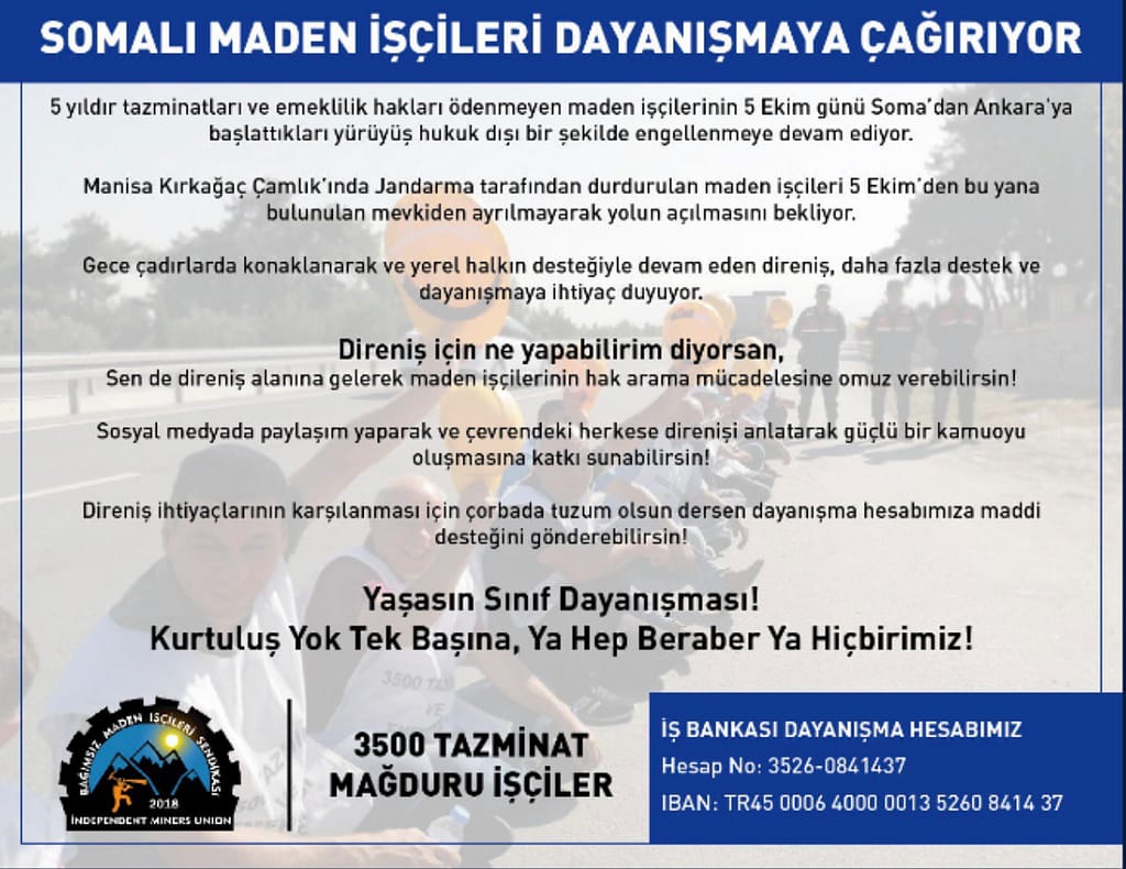 5 yıldır tazminat ve emeklilik alacakları ödenmeyen maden işçilerinin 5 Ekim’de başlattığı yürüyüşe devlet engeli sürüyor. Manisa’nın Soma ilçesinde başlayan ve Ankara’da sonlandırılması planlanan madenci yürüyüşü Manisa Valiliği’nin kararıyla hukuksuzca engellendi.