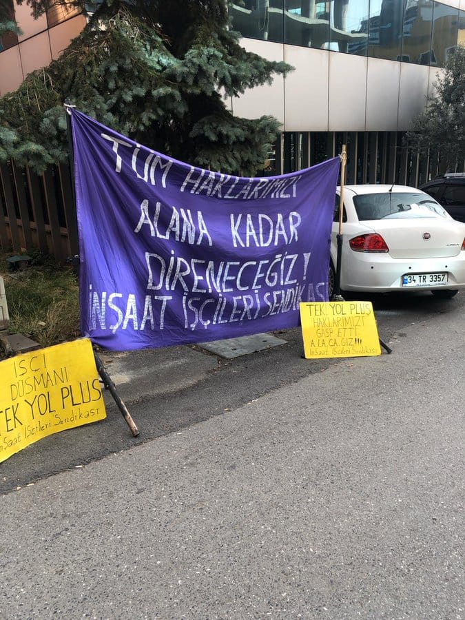 Platin Yapı firmasında çalışırken şirketin iflas ettiği gerekçesiyle maaşları ve tazminatları ödenmeden işten çıkartılan işçiler, İnşaat-İş Sendikası öncülüğünde alacaklarının ödenmesi talebiyle ana yüklenici konumundaki Tek Yol Plus firmasının Kavacık’taki merkez binası önünde eyleme başlamıştı.